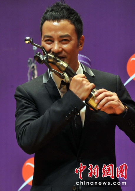 4月18日晚,“第二十九屆香港電影金像獎”頒獎典禮在香港文化中心大劇院隆重舉行,影星任達華憑演出電影「歲月神偷」奪得最佳男主角獎項。圖為任達華親吻最佳男主角獎項。中新社發(fā) 鄧慶樂 攝