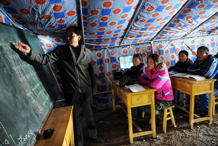 4月18日,70多名孩子在地震四天后重新走進(jìn)了課堂,玉樹州孤兒學(xué)校成為了地震災(zāi)區(qū)第一所復(fù)課的學(xué)校,剛完成帳篷搭建的青海省玉樹藏族自治州第一民族中學(xué)3個(gè)年級(jí)的學(xué)生也開始復(fù)課。圖為4月18日,玉樹藏族自治州第一民族中學(xué)八年級(jí)老師次成尼瑪(左一)在帳篷教室內(nèi)給學(xué)生上課。 圖片來源:新華網(wǎng)