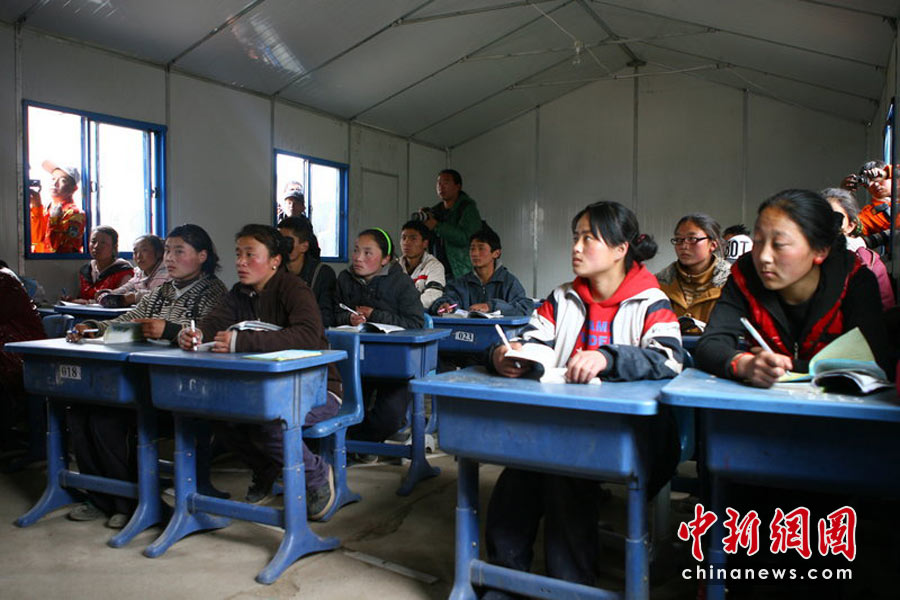 4月18日,70多名孩子在地震四天后重新走進了課堂,玉樹州孤兒學校成為了地震災區(qū)第一所復課的學校,剛完成帳篷搭建的青海省玉樹藏族自治州第一民族中學3個年級的學生也開始復課。青友 攝