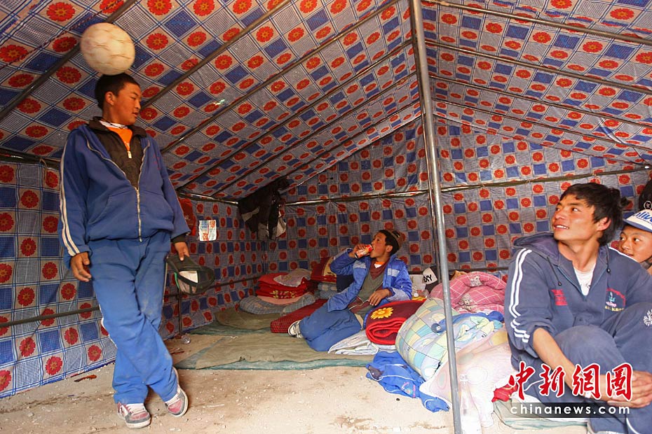 2010年4月19日,青海玉樹縣結(jié)古鎮(zhèn)玉樹縣第一民族中學(xué)的學(xué)生宿舍帳篷內(nèi),德尕扎西(左)在其他同學(xué)面前表演球技,稱自己是“C羅”。中新社發(fā) 盛佳鵬 攝