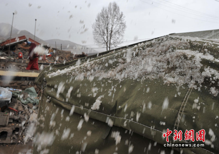 4月20日12時(shí)許,青海玉樹(shù)地震災(zāi)區(qū)天氣突變,雷雹交加,為抗震救災(zāi)造成相當(dāng)困難。中新社發(fā) 賈國(guó)榮 攝