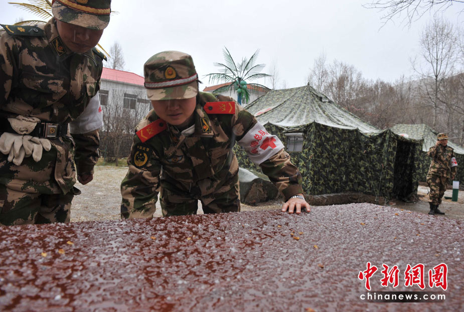 4月20日12時(shí)許,玉樹地震災(zāi)區(qū)突然雷雹交加,給青海武警總隊(duì)醫(yī)療救護(hù)隊(duì)治療抗震救災(zāi)傷員造成困難。中新社發(fā) 賈國榮 攝