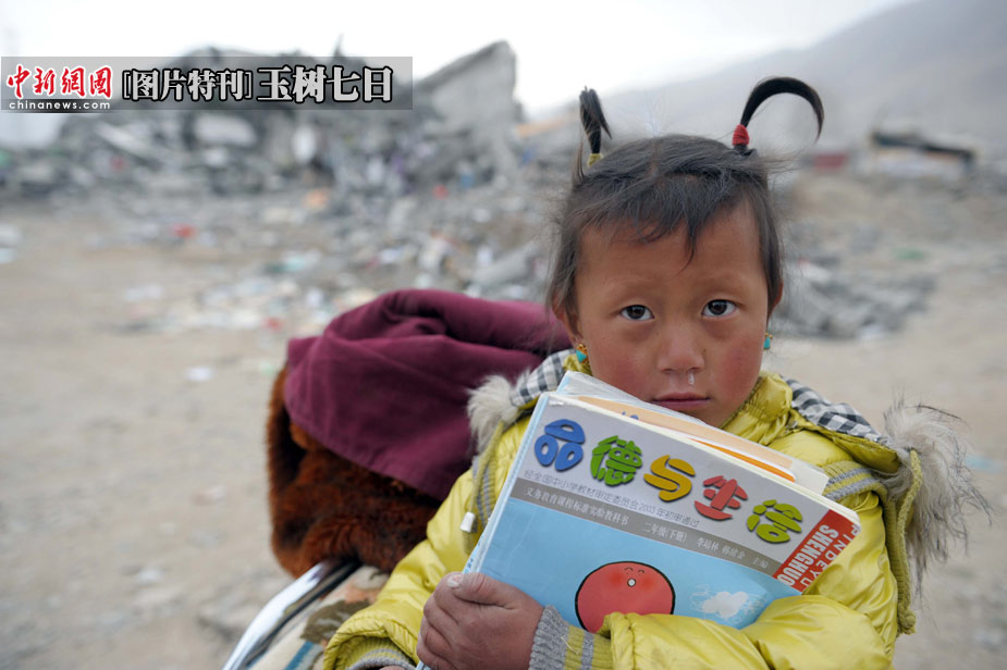 一位上小學(xué)二年級的女童緊抱著自己的課本,站在震后的廢墟前。中新社發(fā) 陳文 攝