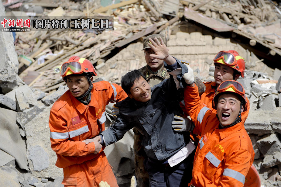 4月15日12時,中國國際地震救援隊在青海玉樹縣結(jié)古鎮(zhèn)西北牛賓館廢墟上救出了四名幸存者,其間經(jīng)歷了三次余震。中新社發(fā) 廖攀 攝