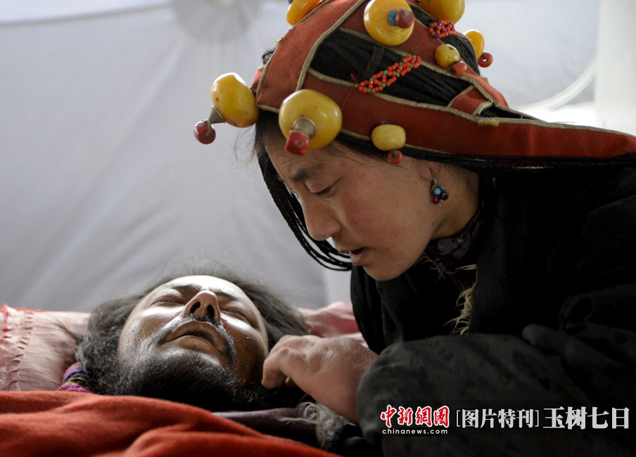 4月16日,青海玉樹體育場(chǎng)武警醫(yī)院醫(yī)療隊(duì)的帳篷里,東周丹增的妻子陪護(hù)丈夫接受治療。東周丹增在地震中肋骨骨折。 中新社發(fā) 廖攀 攝