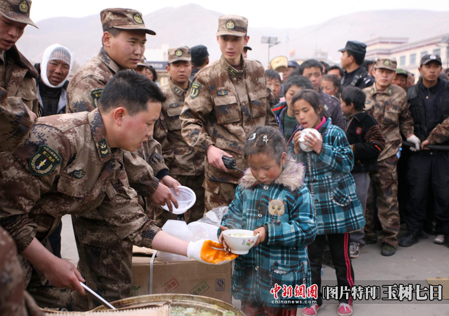 4月16日,青海省玉樹(shù)藏族自治州玉樹(shù)縣地震發(fā)生第三天,為確保災(zāi)民有飯吃、有帳篷住,玉樹(shù)城內(nèi)各個(gè)安置點(diǎn)架起鍋灶為受災(zāi)民眾分發(fā)免費(fèi)食物并幫助搭建帳篷。中新社發(fā) 劉忠俊 攝