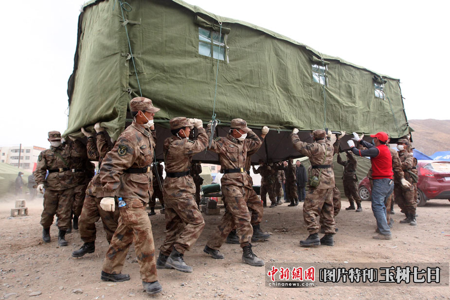 4月17日,青海玉樹(shù)體育場(chǎng)受災(zāi)民眾安置點(diǎn)內(nèi),解放軍救援隊(duì)為安置點(diǎn)整體搬遷帳篷。中新社發(fā) 盛佳鵬 攝