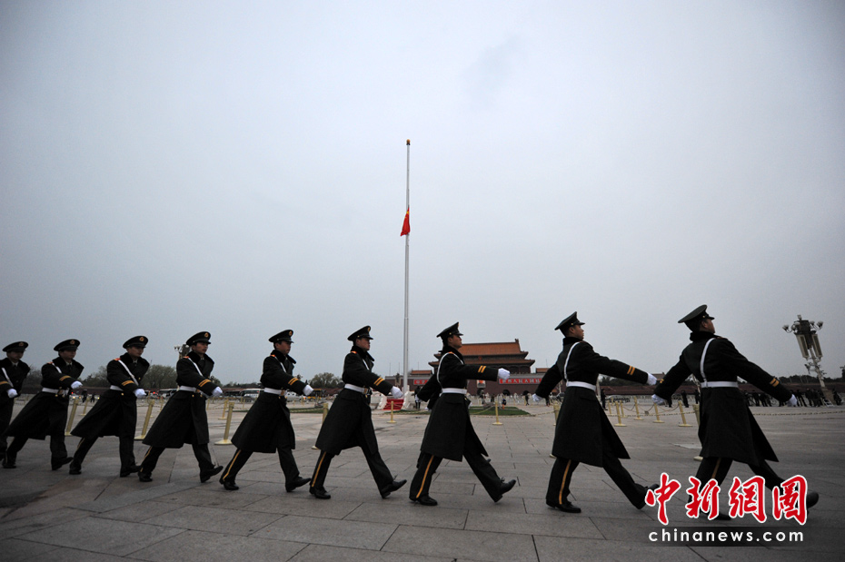 4月21日早晨,北京天安門廣場(chǎng)下半旗向玉樹地震遇難者致哀。中新網(wǎng)記者 金碩 攝