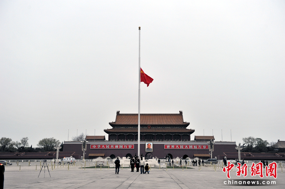 4月21日早晨,北京天安門(mén)廣場(chǎng)下半旗向玉樹(shù)地震遇難者致哀。中新網(wǎng)記者 金碩 攝