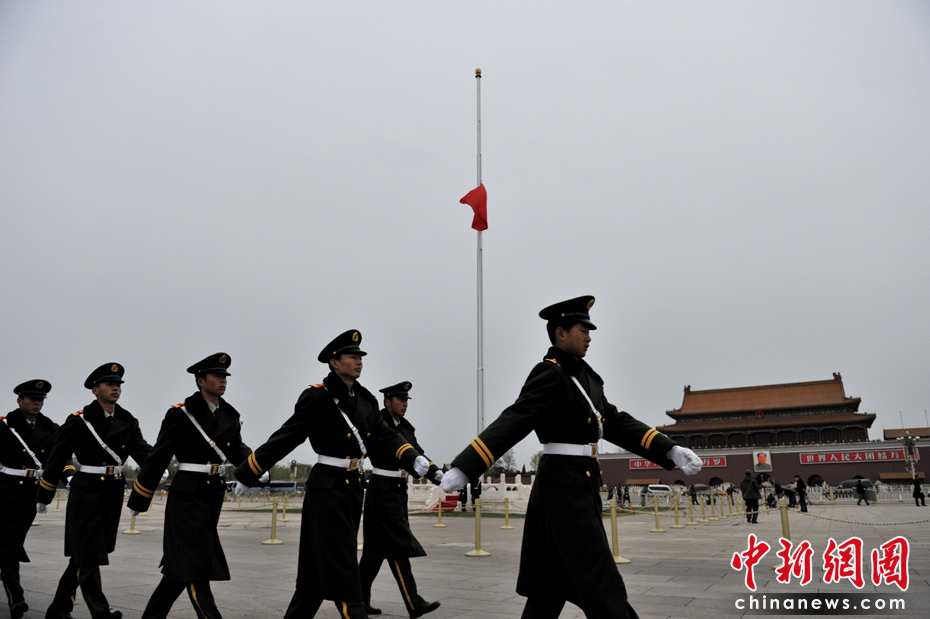 4月21日早晨,北京天安門廣場(chǎng)下半旗向玉樹地震遇難者致哀。中新網(wǎng)記者 金碩 攝