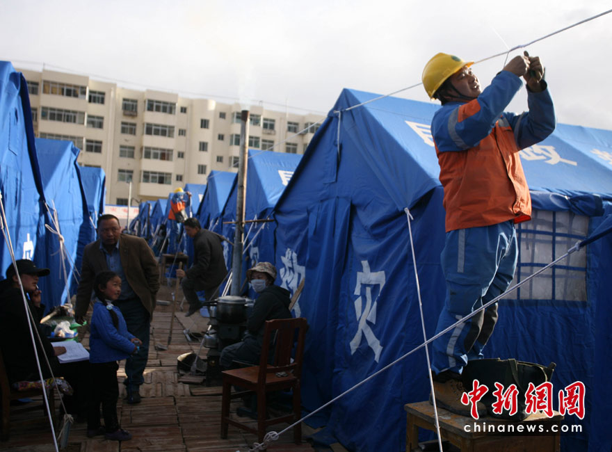 4月20日,國家電網(wǎng)四川公司抗震救災(zāi)突擊隊經(jīng)過辛苦工作,青海玉樹紅旗小學(xué)正式恢復(fù)供電。這是玉樹第一所恢復(fù)供電的學(xué)校。圖為來自四川的電力技術(shù)人員正在為40頂帳篷牽線接燈。中新社發(fā) 劉忠俊 攝