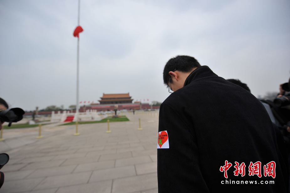 4月21日,為表達全國各族人民對青海玉樹地震遇難同胞的深切哀悼,中國國務院決定,舉行全國哀悼活動,全國和駐外使領館下半旗志哀,停止公共娛樂活動。圖為北京天安門廣場上哀悼遇難者的民眾。中新網記者 金碩 攝