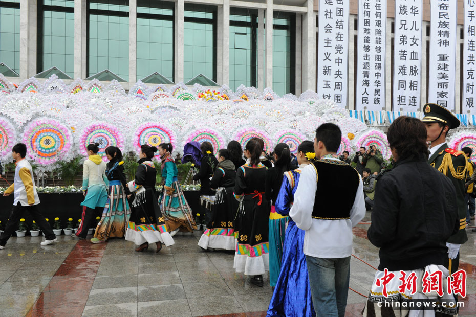 21日上午9時(shí)許,西寧各界民眾冒雪陸續(xù)來(lái)到該市最大的廣場(chǎng)——新寧廣場(chǎng),悼念玉樹(shù)地震遇難同胞。中新社記者 符永康 攝