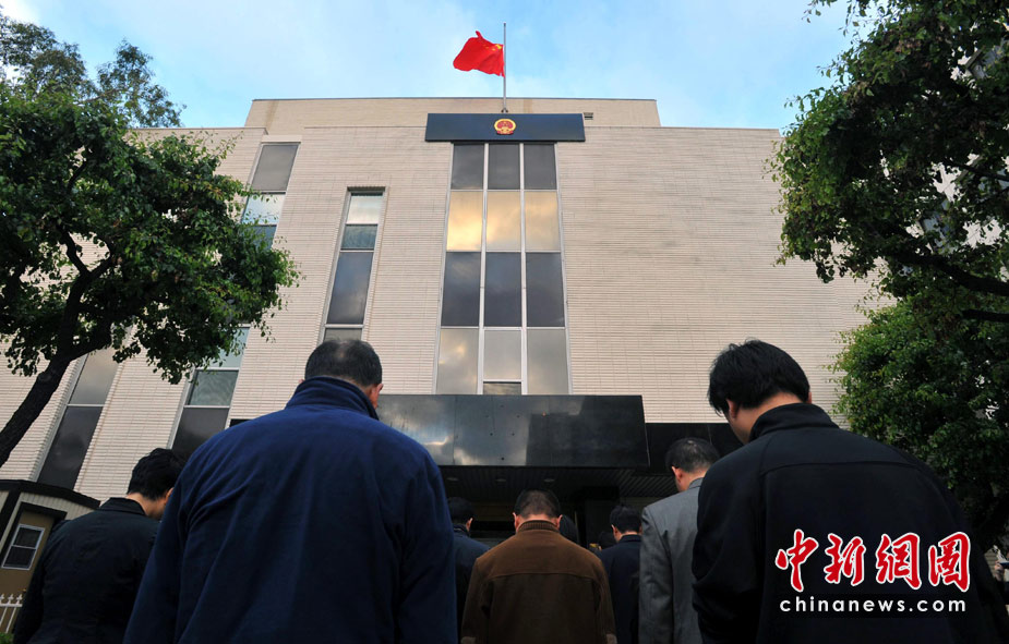 當(dāng)?shù)貢r間4月21日清晨,中國駐洛杉磯總領(lǐng)事館在總領(lǐng)館大樓前舉行降半旗儀式,向青海玉樹地震遇難同胞表示深切悼念。中新社發(fā) 張煒 攝