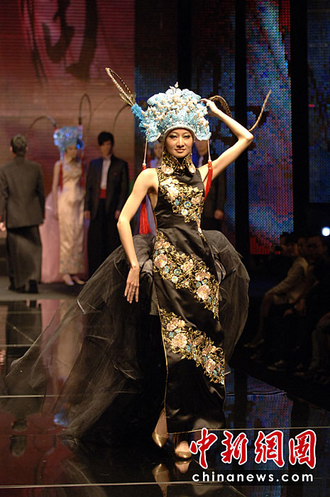 4月20日晚,首屆海西國際時裝周在福建石獅閉幕,本屆時裝周吸引了來自海峽兩岸的紡織服裝界企業(yè)家和知名服裝設(shè)計師。期間舉辦了12場時裝品牌和設(shè)計師作品動態(tài)發(fā)布會。圖為模特展示古今潮流結(jié)合的服裝。王東明 攝