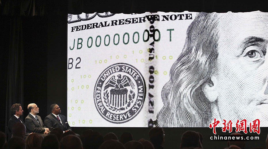 圖為新款百元美鈔發(fā)布會(huì)現(xiàn)場