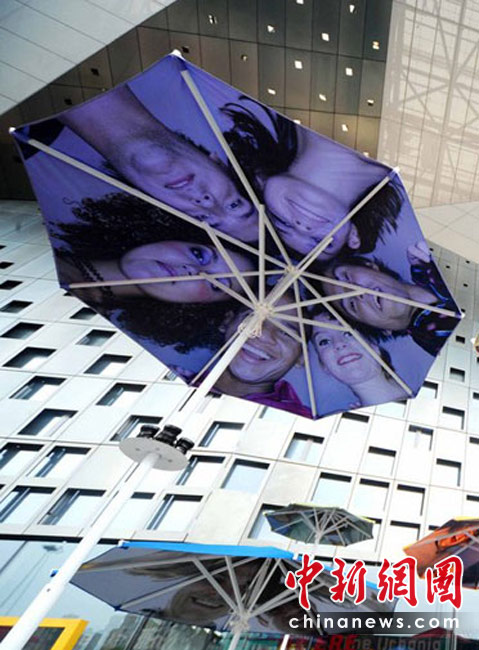 2010年4月22日,上海世博會主題館門前的觀眾等候區(qū),豎立著一把把遮陽的花傘,每一把花傘上都印著四方友人的燦爛微笑。世博園區(qū)為了應對大量客流,園區(qū)設置了大量遮陽和避雨設施,遮陽避雨面積總量達40萬平方米。楊毅 攝