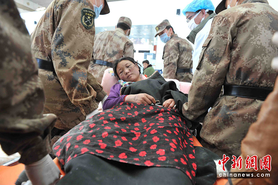 記者組隨救災帳篷一起卸下,快速進入機場大廳,只見滿地躺著亟待救治的重傷員,還有多位因高原反應強烈而輸液撤離的救援隊員。