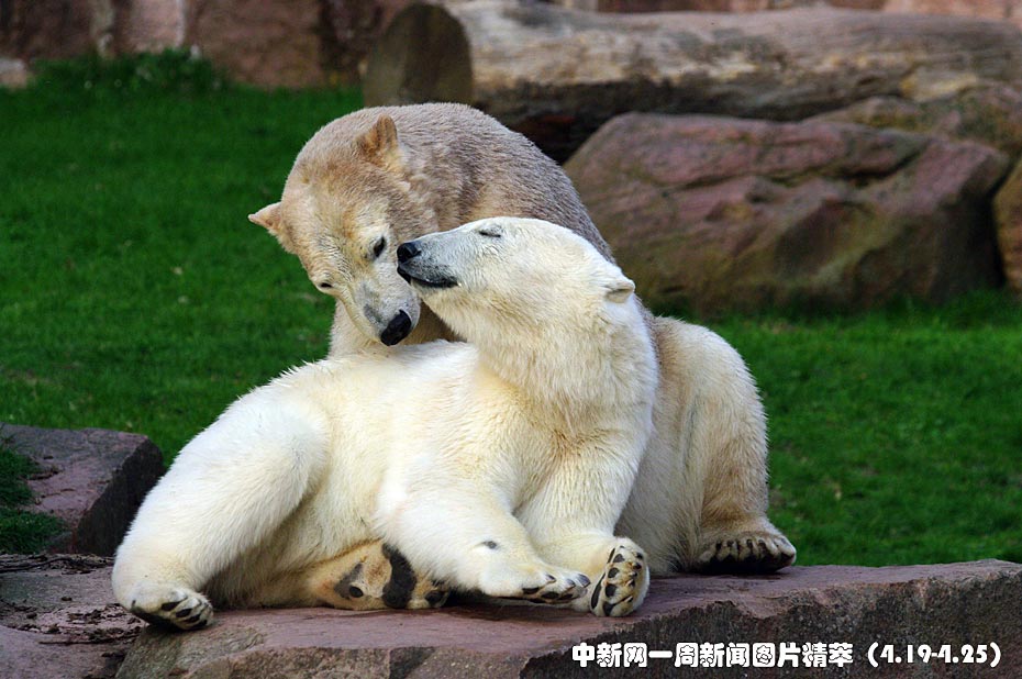 周五(23日),德國(guó)紐倫堡動(dòng)物園內(nèi),兩頭北極熊在公園內(nèi)的水池中盡情玩耍,享受春天的陽光。