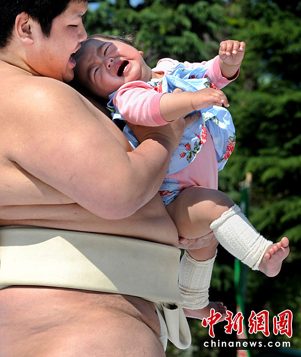 4月25日,日本東京,幾名相撲手手抱嬰兒,正努力使嬰兒哭泣。當(dāng)日,一年一度的日本一周歲以下嬰兒啼哭大賽在東京淺草寺舉行。第一個(gè)讓嬰兒哭泣的選手將贏得比賽,日本通過(guò)此種比賽為孩子的健康祈福,他們認(rèn)為嬰兒哭泣將對(duì)他們將來(lái)的身體健康有利。圖片來(lái)源:中國(guó)新聞網(wǎng)