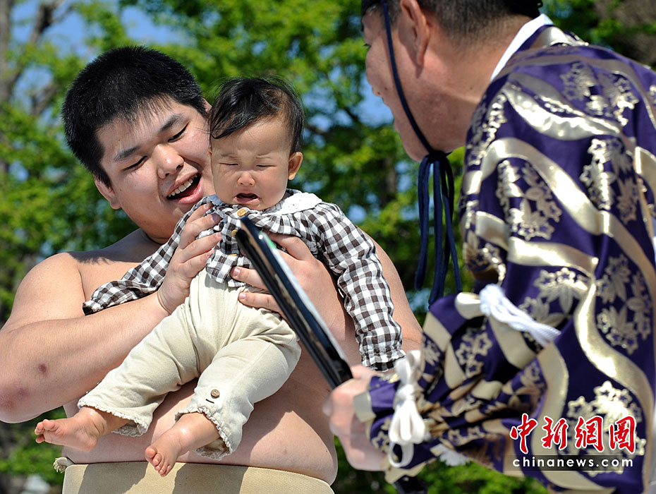 4月25日,日本東京,幾名相撲手手抱嬰兒,正努力使嬰兒哭泣。當(dāng)日,一年一度的日本一周歲以下嬰兒啼哭大賽在東京淺草寺舉行。第一個讓嬰兒哭泣的選手將贏得比賽,日本通過此種比賽為孩子的健康祈福,他們認為嬰兒哭泣將對他們將來的身體健康有利。圖片來源:中國新聞網(wǎng)