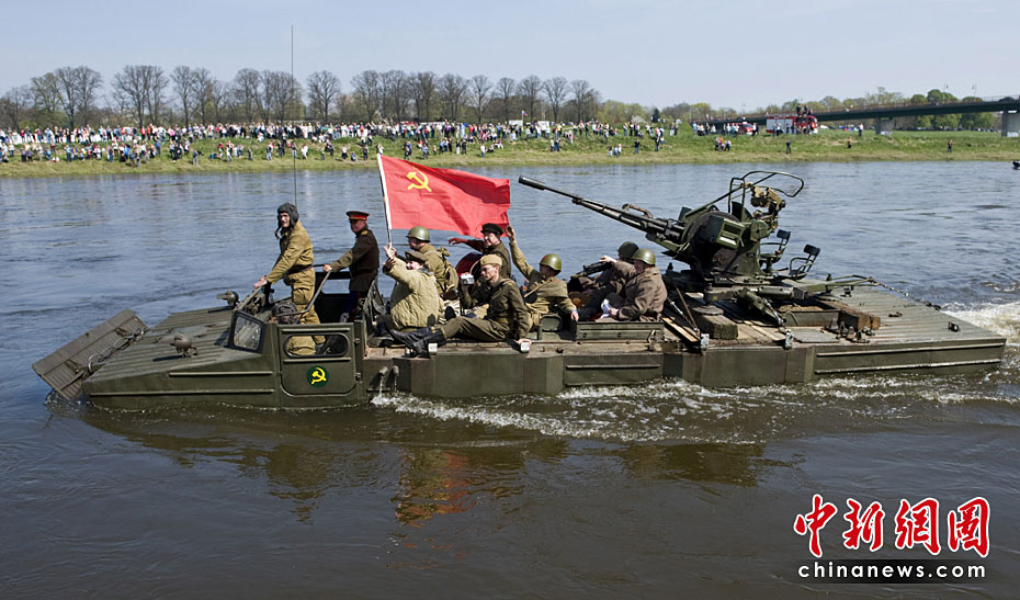德國當(dāng)?shù)貢r(shí)間4月24日,演員身著二戰(zhàn)時(shí)期美蘇軍裝在德國托爾高南部易北河畔的一座小橋上重現(xiàn)當(dāng)年的“會師”一幕。