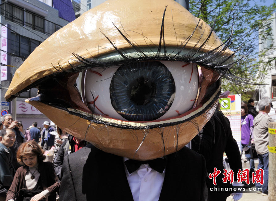 4月26日,日本一個(gè)表演藝術(shù)團(tuán)體扮成“獨(dú)眼怪人”在街頭亮相,大玩行為藝術(shù)。