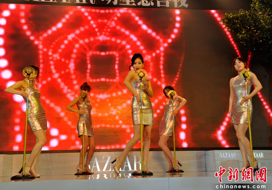 4月25日,由《時尚芭莎》雜志社主辦的第8屆“BAZAAR明星慈善夜”活動在上海舉行,圖為韓國少女組合Wonder Girl參加晚宴并現場演唱漢語版《nobody》。 中新網記者 金碩 攝