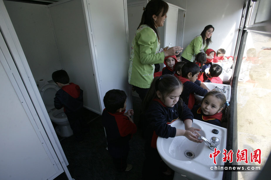 4月26日,今年2月遭受8.8級(jí)強(qiáng)烈地震的智利康塞普西翁市,兒童們?cè)凇鞍褪繉W(xué)校”里上課。