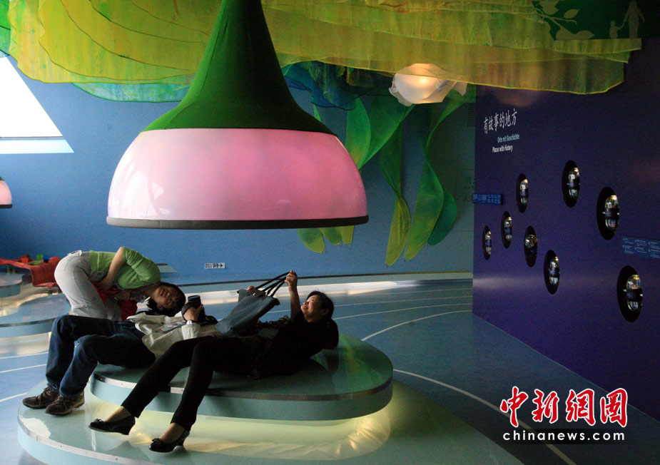 4月27日,三位年輕女記者在上海世博會德國館內(nèi)以各種獨特的姿勢探秘故事。當天,上海世博會組織者特邀注冊媒體參觀部分場館。中新社發(fā) 潘索菲 攝