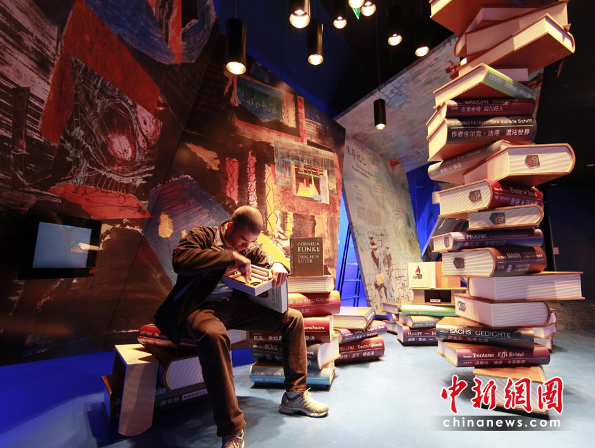 4月27日,上海世博會(huì)德國館向媒體記者開放,一名工作人員還在緊張布置書籍堆砌的景觀。中新社發(fā) 盛佳鵬 攝