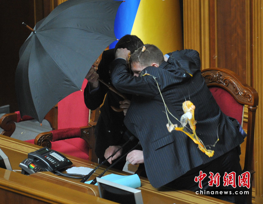 4月27日,基輔,烏克蘭議會(huì)就俄羅斯黑海艦隊(duì)駐扎問題進(jìn)行討論時(shí)出現(xiàn)混亂,數(shù)千人在議會(huì)外示威,會(huì)場(chǎng)內(nèi)有人投擲煙霧彈和雞蛋,大廳內(nèi)煙霧彌漫,場(chǎng)面一度混亂。圖為議長藏在傘后躲避不斷飛來的雞蛋。