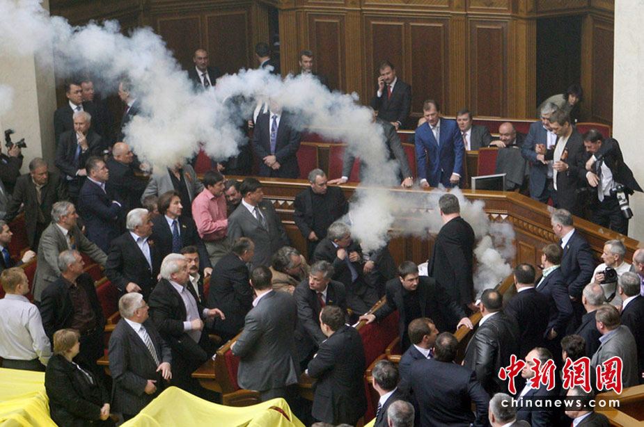 4月27日,基輔,烏克蘭議會(huì)就俄羅斯黑海艦隊(duì)駐扎問(wèn)題進(jìn)行討論時(shí)出現(xiàn)混亂,數(shù)千人在議會(huì)外示威,會(huì)場(chǎng)內(nèi)有人投擲煙霧彈和雞蛋,大廳內(nèi)煙霧彌漫,場(chǎng)面一度混亂。