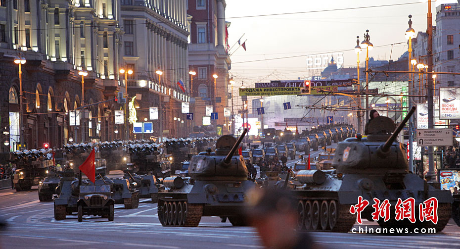 此次紅場閱兵包括兩部分內(nèi)容:歷史部分和現(xiàn)代部分。歷史部分由身穿衛(wèi)國戰(zhàn)爭時期軍服的士兵在鵝卵石道上進(jìn)行,同時還會有9輛T-34坦克和8輛SU-100自行火炮,F(xiàn)代部分由13輛老虎裝甲車、BTR-80裝甲車、BMP-3步兵戰(zhàn)車、T-90A坦克和S-400防空系統(tǒng)等。圖片來源:中國新聞網(wǎng)