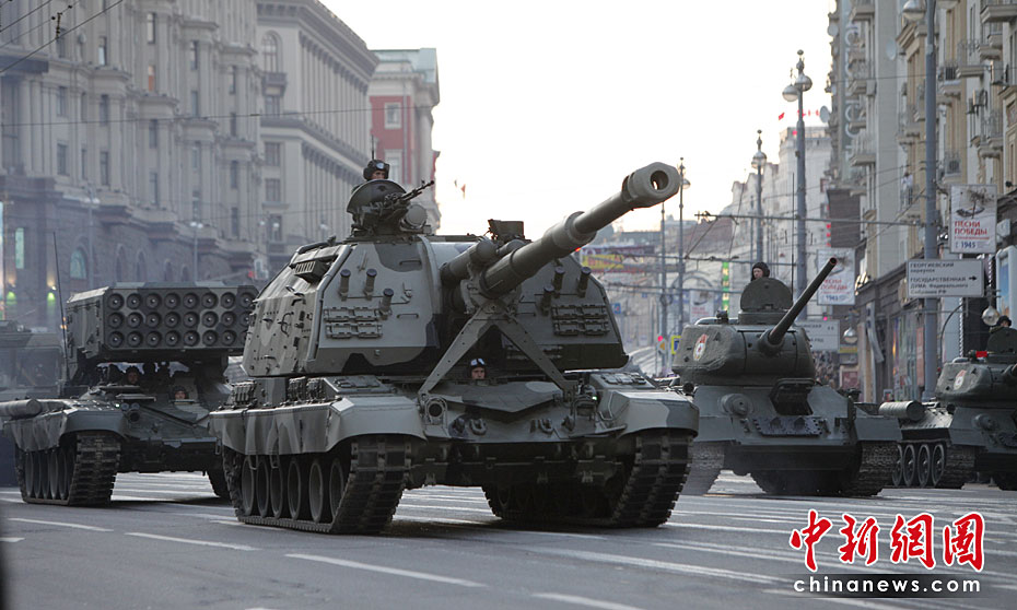 此次紅場閱兵包括兩部分內(nèi)容:歷史部分和現(xiàn)代部分。歷史部分由身穿衛(wèi)國戰(zhàn)爭時期軍服的士兵在鵝卵石道上進行,同時還會有9輛T-34坦克和8輛SU-100自行火炮,F(xiàn)代部分由13輛老虎裝甲車、BTR-80裝甲車、BMP-3步兵戰(zhàn)車、T-90A坦克和S-400防空系統(tǒng)等。圖片來源:中國新聞網(wǎng)
