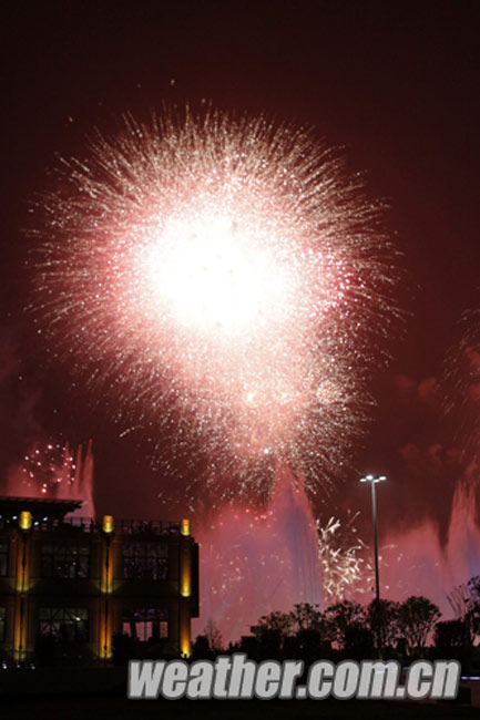 2010年4月27日,上海世博會(huì)開(kāi)幕式彩排順利進(jìn)行。圖為酷似英國(guó)館的煙花。卞赟 攝