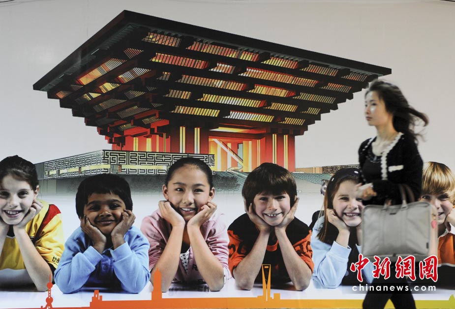 4月29日,一位女士經(jīng)過上海地鐵通道里的世博會海報前。世博會開幕前,面臨“大考”的上海充滿喜慶氣氛。 中新社發(fā) 廖攀 攝