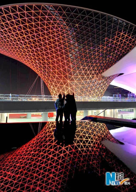 靜待開幕的世博園沉浸在一片暮色中,流光溢彩,給人無限遐想。從外灘到世博園,“夜”上海不斷延伸,讓人激情跳躍。圖片來源:新華網(wǎng)孫巍攝