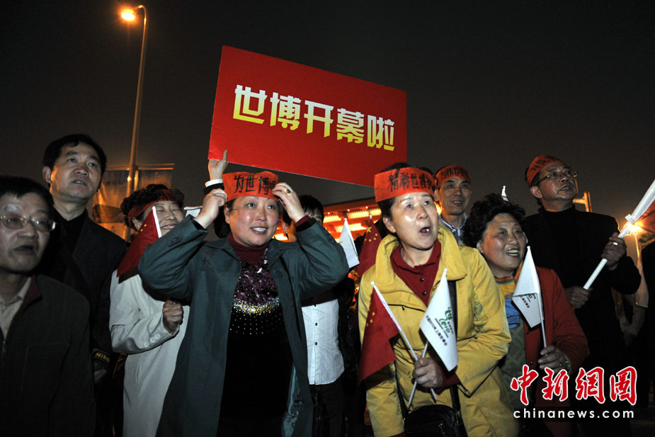 30日晚上8時,2010年上海世博會正式拉開帷幕。上海周家渡動遷居民和志愿者在中國館前打出“世博開幕啦”的大牌子,高喊:“世博開幕啦!我們開心死啦!”中新網(wǎng)記者 王紅綱 攝