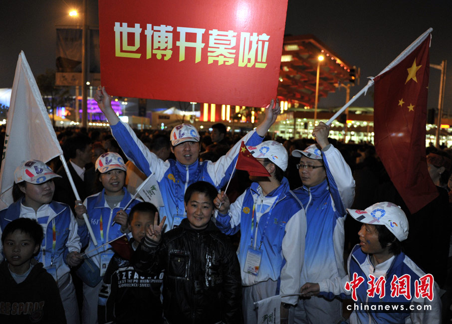 30日晚上8時,2010年上海世博會正式拉開帷幕。上海周家渡動遷居民和志愿者在中國館前打出“世博開幕啦”的大牌子,高喊:“世博開幕啦!我們開心死啦!”中新網(wǎng)記者 王紅綱 攝