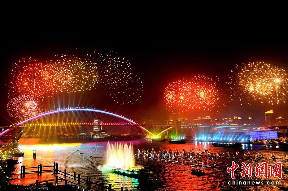 4月30日晚,中國(guó)2010年上海世博會(huì)開幕式大型燈光噴泉焰火表演在上海舉行。圖片來(lái)源:中國(guó)新聞網(wǎng)