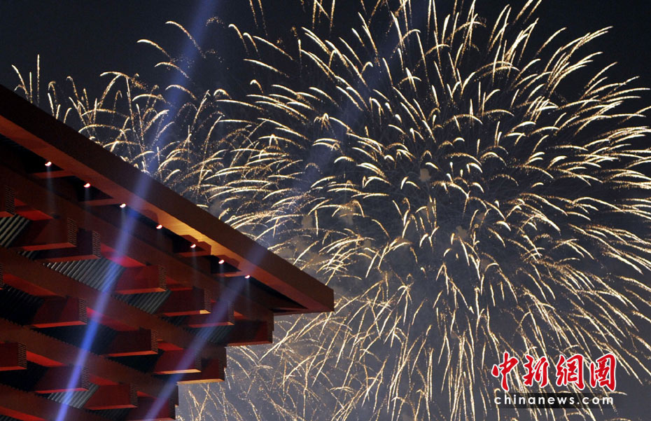 4月30日晚,2010年上海世博會開幕式在上海世博園世博文化中心舉行。21時28分,世博會焰火燈光表演開始。黃浦江兩岸綿延3.28公里同時奏響火樹銀花不夜天的華彩世博樂章。中新網記者 王紅綱 攝