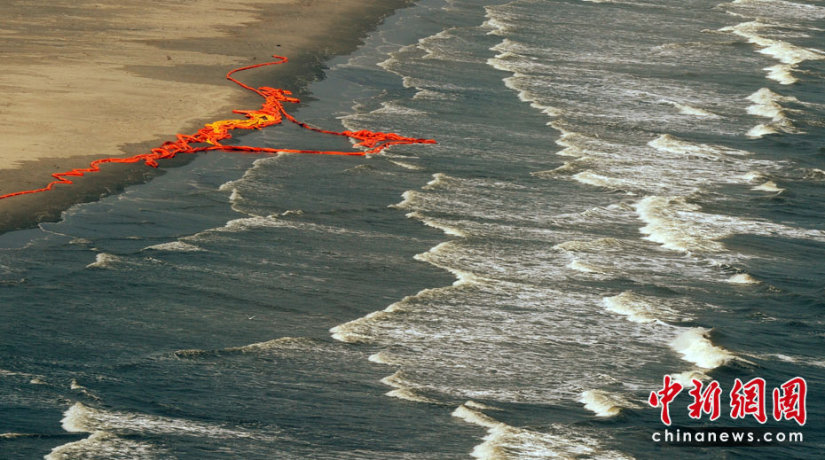 4月30日,在美國路易斯安那州海岸,為阻隔原油擴散而設(shè)的護欄帶被海風(fēng)浪沖到岸邊。當(dāng)天,美國總統(tǒng)奧巴馬下令調(diào)查墨西哥灣石油鉆井平臺爆炸事件,以避免將來類似事件再次發(fā)生。平臺爆炸沉沒后泄漏的原油當(dāng)天已漂至美國沿岸。圖片來源:中國新聞網(wǎng)