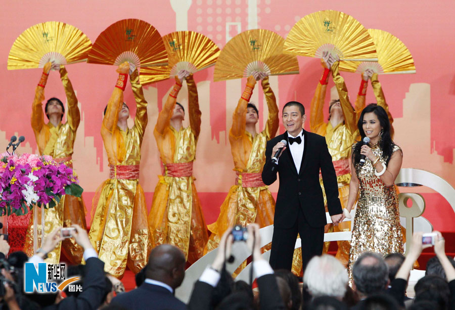 5月1日,中國2010年上海世博會開園儀式在上海世博園世博中心舉行。這是劉德華(左)和韋唯在開園儀式上獻唱。 裴鑫 攝(新華網(wǎng))