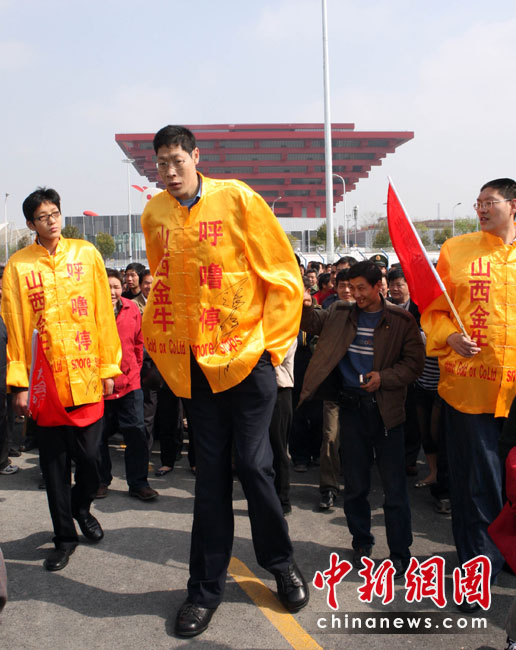 5月1日,三位平均身高2.30米以上的中國巨人到上海世博園區(qū)參觀中國館,吸引了眾多游客好奇的目光。當日,上海世博會正式開園。中新社發(fā) 湯彥俊 攝