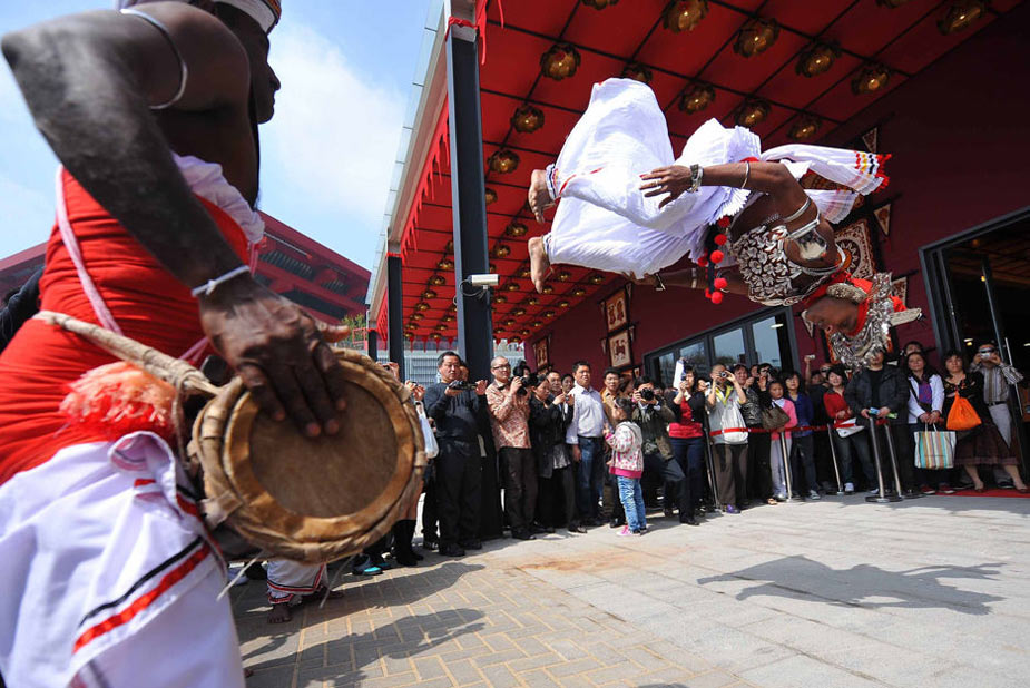 5月1日,上海世博會(huì)正式開園迎客,首批游客入園參觀。圖為斯里蘭卡館門口的舞蹈表演吸引眾多參觀者駐足觀看。 羅曉光 攝