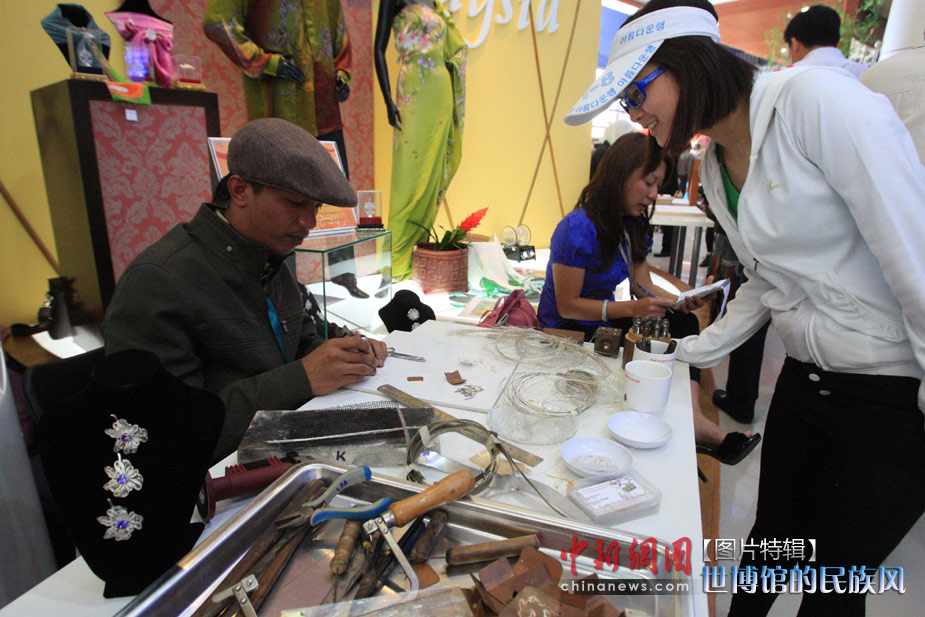 5月1日,上海世博會(huì)馬來西亞館開館,手工藝人用金銀絲打造漂亮的胸針,讓參觀者驚訝不已。中新社發(fā) 潘索菲 攝。