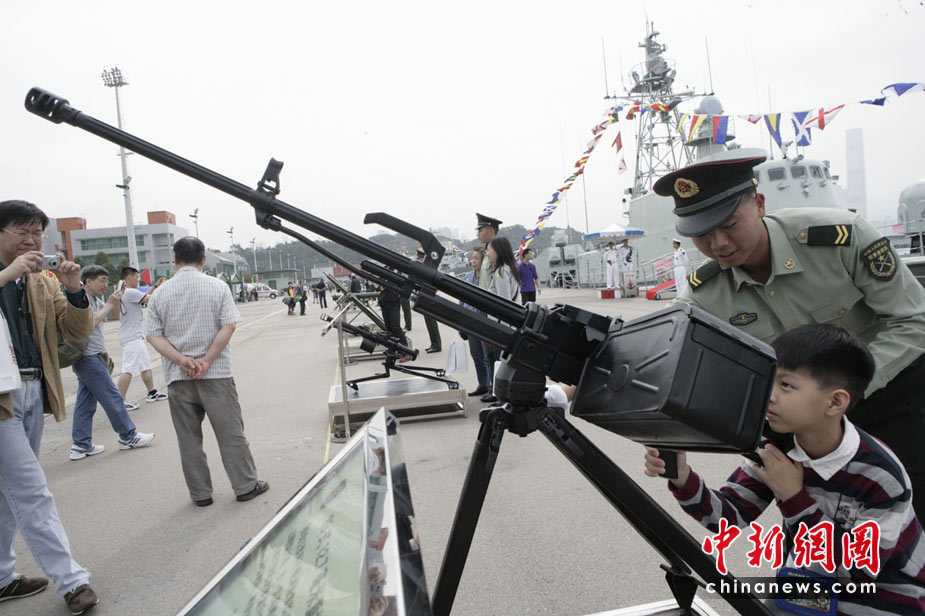 為慶!拔逡弧眹H勞動節(jié),進一步增進與香港社會各界相互溝通與交流,中國人民解放軍駐香港部隊5月1日開放了昂船洲軍營,共有約13000名市民前往參觀。圖為香港市民近距離參觀武器展示。中新社發(fā) 張勤 攝