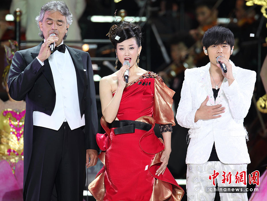 圖為宋祖英、波切利、周杰倫共同演唱“友誼地久天長”。王保勝 攝