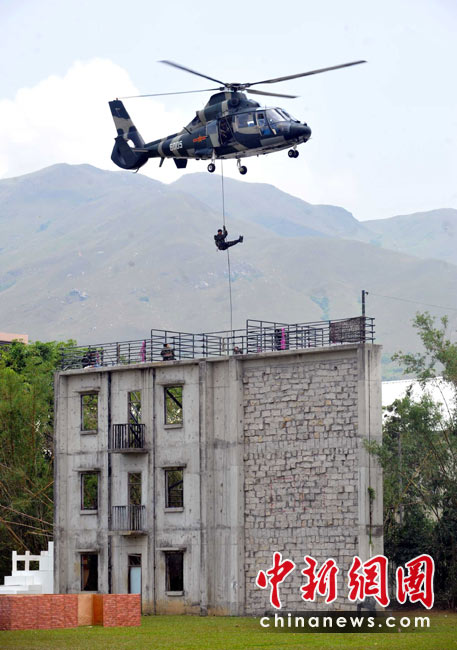 為慶!拔逡弧眹H勞動節(jié),進一步增進與香港社會各界相互溝通與交流,中國人民解放軍駐香港部隊5月2日開放了石崗軍營。圖為駐港部隊反恐突擊和陸空協(xié)同救援演練表演。 中新社發(fā) 鄧慶樂 攝